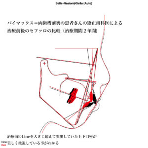 (バイマックス=両歯槽前突で口元のとんがった患者さんの矯正歯科医による矯正治療前後の口元の変化をセファロレントゲンの重ね合わせで評価 : 黒が治療前/赤が矯正治療後)